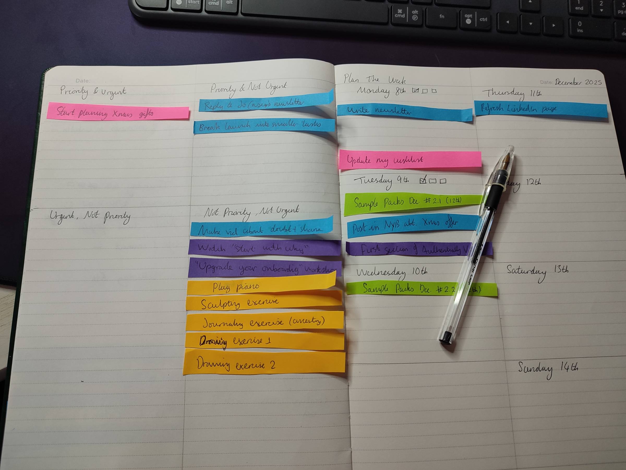 And this is what I came up with. I can add and prioritise tasks in the grid on the left. Them schedule them into the week on the right. Rating: ⭐️⭐️⭐️⭐️⭐️ 5/5 This is the one. I get a sense of novelty from writing down tasks and sticking them in. The bright colours make it FUN. It's a very obvious visual cue if I've stuffed loads of different colours into one day that... it's not gonna work. And there's something... better about physically organising things on paper, rather than a screen. If you are doing some kind of restructuring like this too, I hope it's going well! Much love, Damon 🌱 Stuff I'm Doing Recently 🌱December Week #2 (Links with an * are affiliate) Find me on: My Website | TikTok | LinkedIn P.S. want to work with me? Here's how: