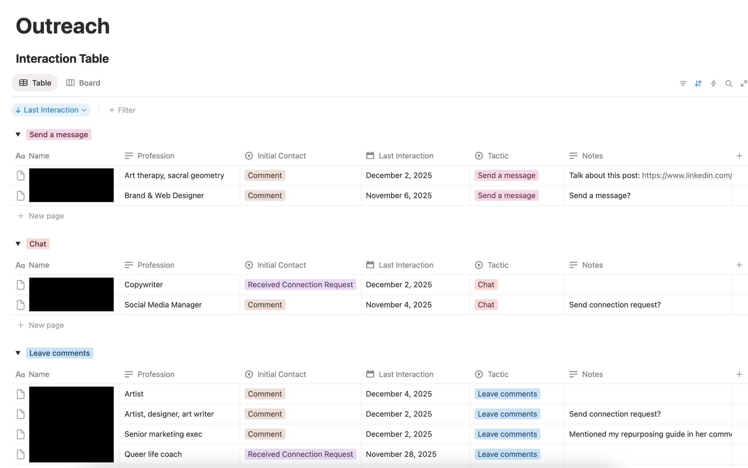 Hiiiii Reader! How are you doing? Everyone's saying 2025 has been hard/weird/unpredictable. And they're not wrong 🫠 It's been chaotic. There's a lot going on. Though I'm feeling quietly pleased with myself because I've got more done lately than for a long time. (Sorry if you haven't. I'm bragging.) This year has pushed me to lock tf in and Systemise. Everything. I previously avoided productivity systems like this because I didn't understand how I worked. Planners, calendars, trackers, etc. They never fit me. It was much more effort to use them compared to the reward they're supposed to provide. I'd give up immediately. But having made more progress on the "understand yourself" front, this year I'm trying again 😁 It felt like the right time to bring some clarity and efficiency to how I work. Here are some systems I've built recently. I hope you can take some inspiration from them? Content HubI've never liked content calendars or "batching content". I mostly post things at random/last minute. This Notion database is my attempt to create a system. It has one main goal: To remind me to use ideas AT LEAST 3 TIMES. One idea = at least 3 pieces of content. This saves so much energy. The database lets me stick an idea in the top part, then below I can add multiple pieces that link back to it. Rating: ⭐️⭐️⭐️☆☆ 3/5 It's okay. I hoped it would inspire me to post more but it hasn't 😆 I also need to add an easier way to capture ideas when I have them. Outreach TrackerOne of the scary parts of freelancing is that you have to face the cringe.... and go network with people 😩 This Notion database helps me track who I've talked to on LinkedIn. I can add labels to people I want to send a DM to. I can see who I haven't talked to in a while, and then go comment on their recent posts. Rating: ⭐️⭐️⭐️⭐️☆ 4/5 It's not COMPLETELY perfect. I think it could do better when paired with a system for starting conversations, e.g. "message X number of new people per week". But without this I probably would have forgotten about every person on there 😂 Weekly PlannerMy wonderful business coach Dan suggested using a physical task tracker, with a combo of: